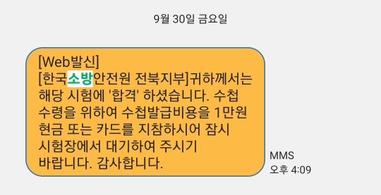 몇 분 후 여기저기서 띠링 띠링하면서 저에게도 합격 문자가 왔습니다.