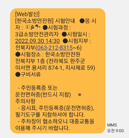 시험일자가 다가오면 이렇게 문자로 안내가 됩니다.