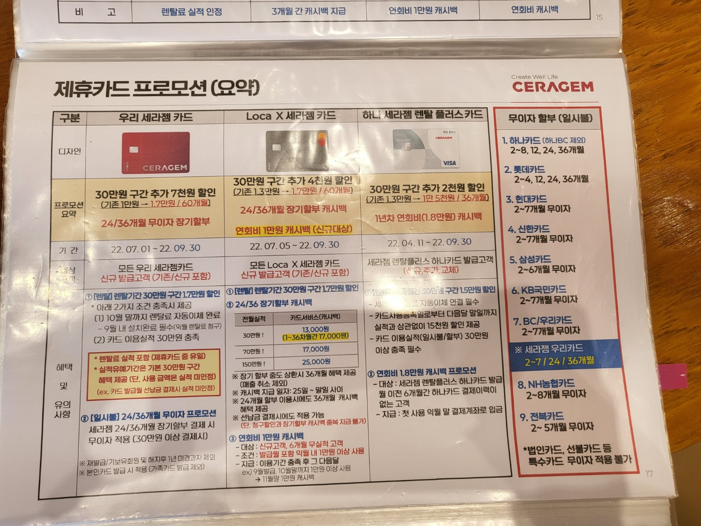 LOCA×세라젬(롯데카드)(전월 실적 30만 원 (무이자 할부 금액 미포함) 이상 사용 시 36개월간 17,000원 캐시백, 연회비 2만 원)입니다.