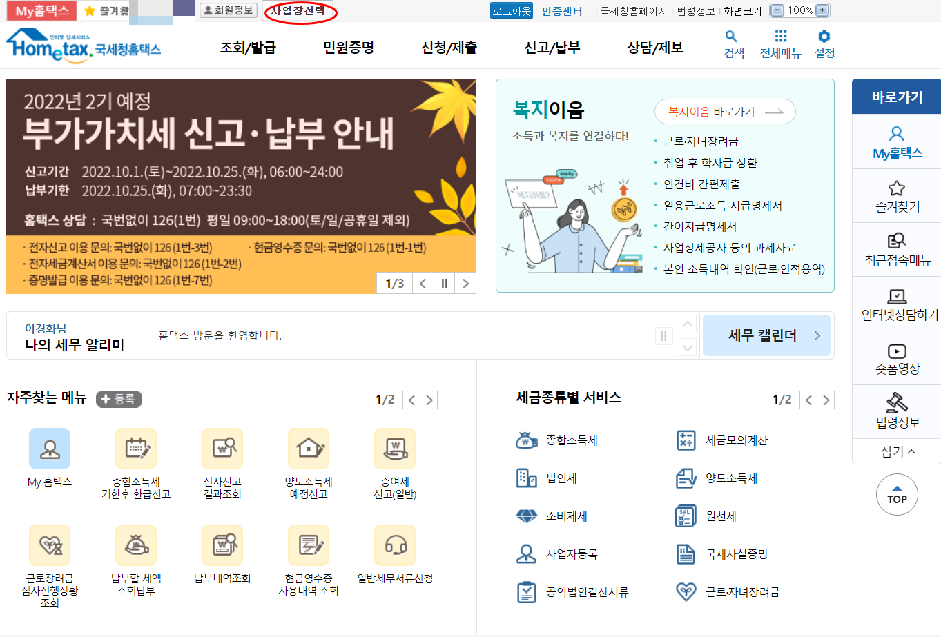 위 화면처럼 사업장 선택을 누르시면 개인에서 사업자로 전환이 됩니다.