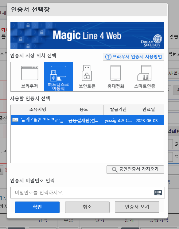 그럼 발급을 위해 전자세금계산서 발급용 인증서를 선택하여 비밀번호 입력하시면 전자세금계산서 발행이 마치게 됩니다.