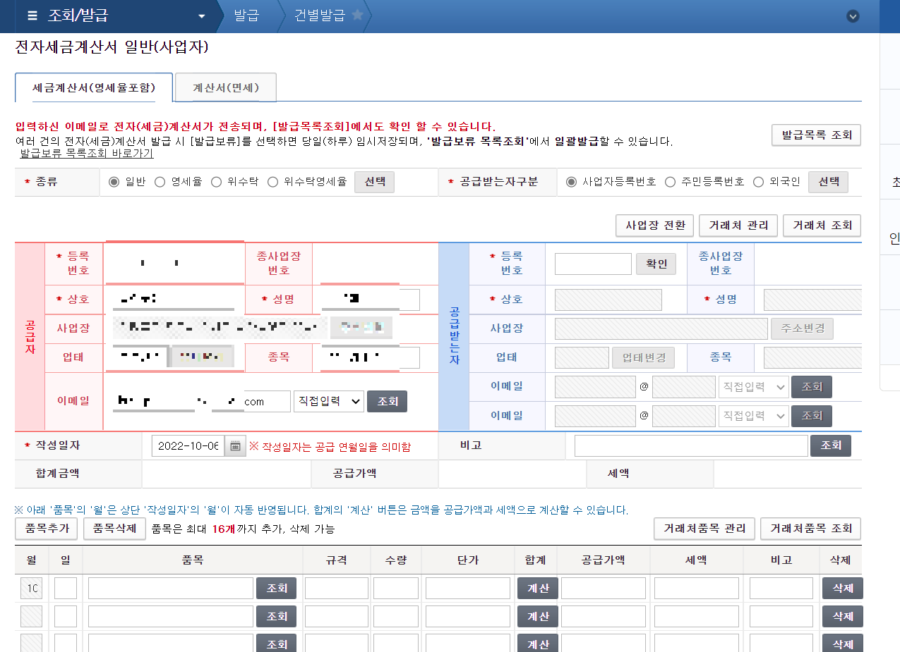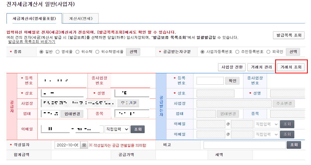 이렇게 9월에 모두 발급하고 나면, 10월부터는 거래처 조회에서 발급했던 거래처들이 조회되어 클릭만 하면 정보들이 자동으로 불러와지니 훨씬 수월합니다.