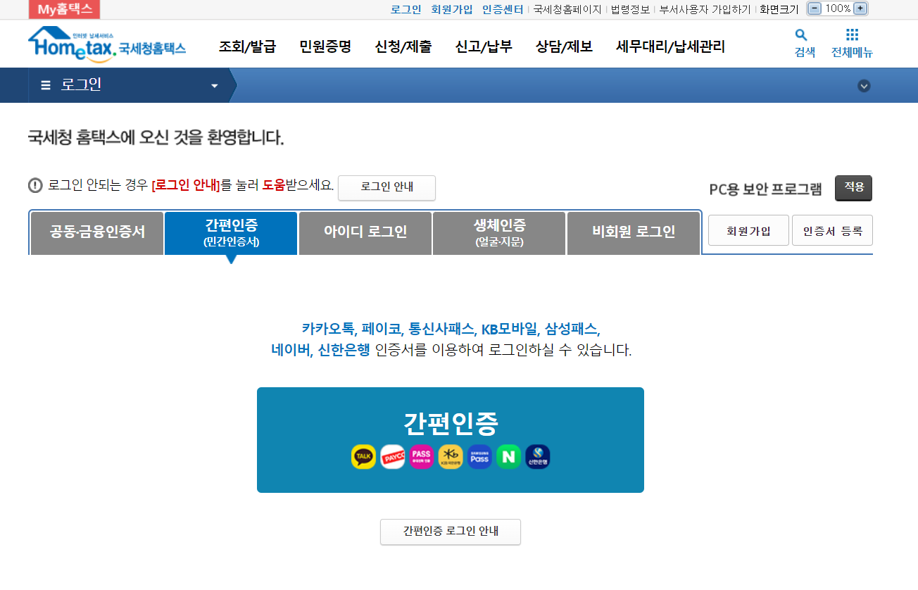 공동 인증서를 등록하셔서 로그인하셔도 되지만 어차피 전자세금계산서 발행용 인증서가 있으면 전자 세금계산서 발행에는 문제가 없기에 전 간편 인증으로 로그인하였습니다.