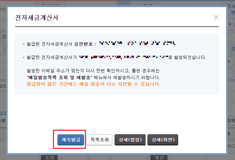 그럼 다음으로 메일로 발송되었다는 안내와 이어서 계속 발급을 하실 거면 계속 발급을 클릭하시면 다시 발급 화면으로 전환하게 됩니다.
