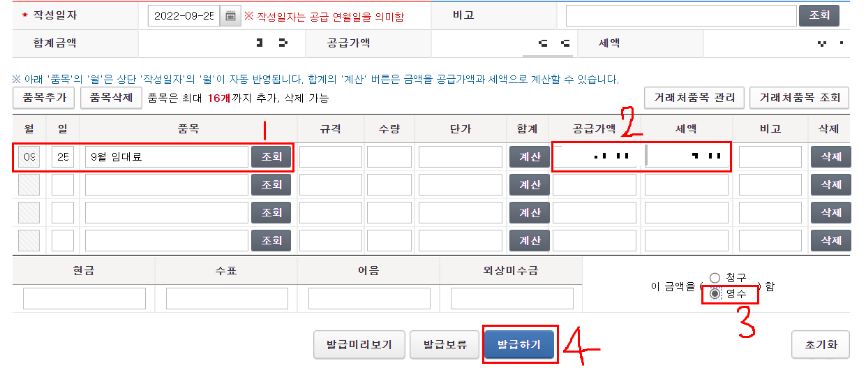 그래서 작성일자는 꼭 계약서상의 임대료 날짜나 그 달로 입력하시는 게 좋습니다.