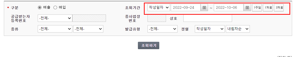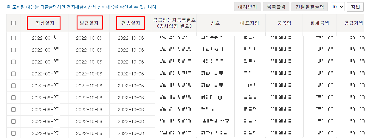 그럼 조회 기간을 선택 후 및 작성일자와 발급일자, 전송 일자가 있는데 작성일자는 아까 입력한 일자이고 발급일자와 전송 일자는 발행한 오늘 날짜가 됩니다.