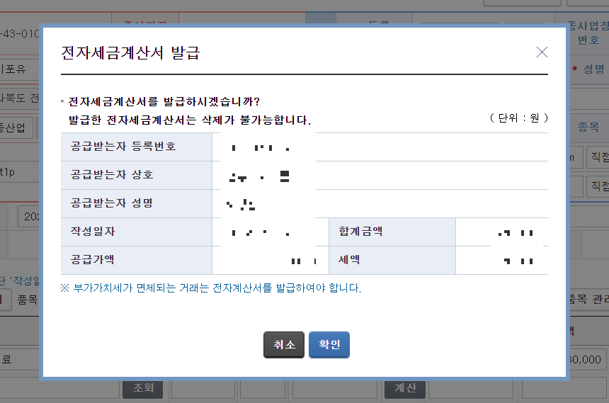 발급한 전자세금계산서는 삭제가 불가능하다고 하니 잘 확인하시고 발급하시 바랍니다.