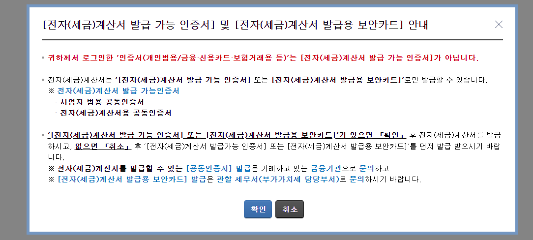 위 내용은 전자세금계산서 발급용 인증서가 없으면 전자세금계산서를 발급할 수 없으니 없다면 금융기관에 먼저 방문하여 발급 후 전자세금계산서를 발급하시라는 내용입니다.