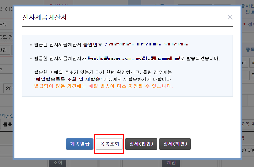 잘 맞게 발급되었는지 확인하고 싶다면 이 화면에서 목록 조회를 클릭하시면 됩니다.