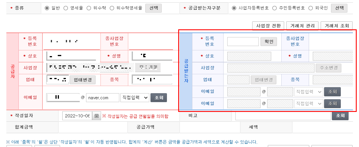 공급받는 자의 등록번호, 상호, 성명은 필수로 입력하여야 합니다.