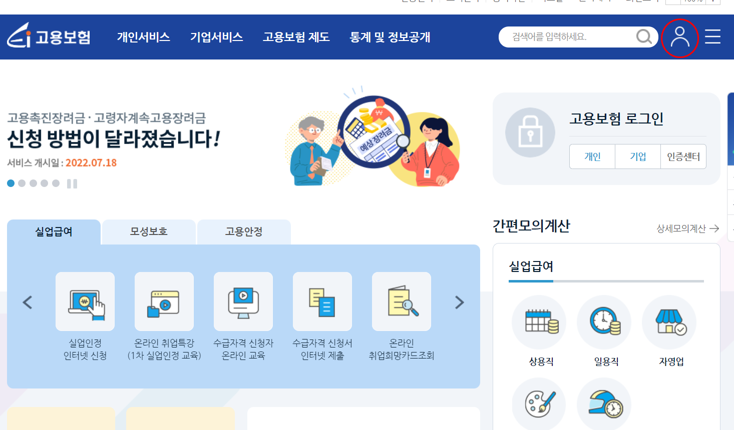 검색창에 '고용보험'이라고 입력하고 들어가면 고용보험 홈페이지가 나타납니다.