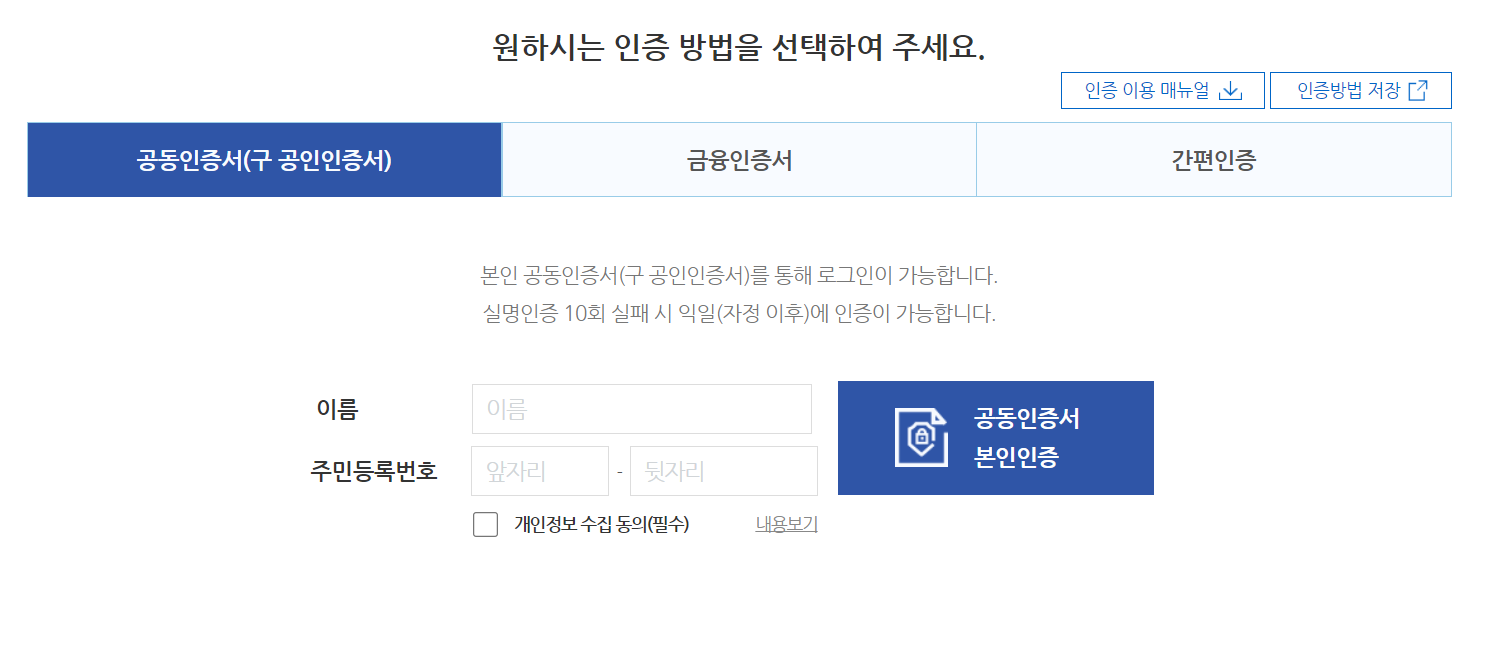 공동 인증서가 컴퓨터에 깔려 있다면 공동 인증서로, 없다면 간편 인증 등 편하신 것으로 선택하여 로그인하시면 됩니다.