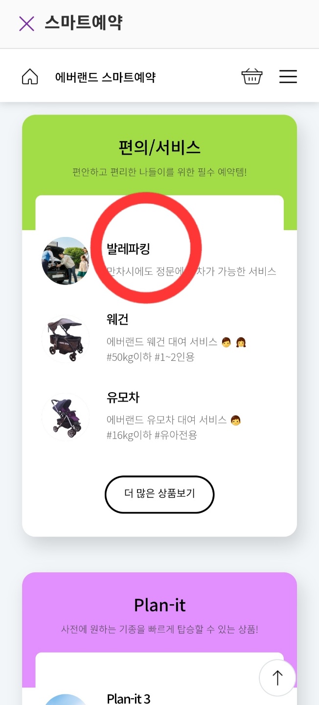 위 같은 화면이 뜨는데요~ 그 페이지를 아래로 쭉 내리다 보면 편의/서비스에 발레파킹을 누릅니다.