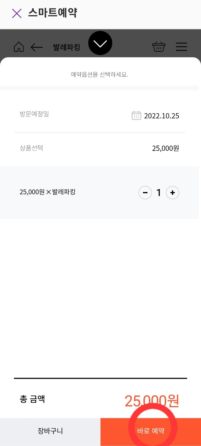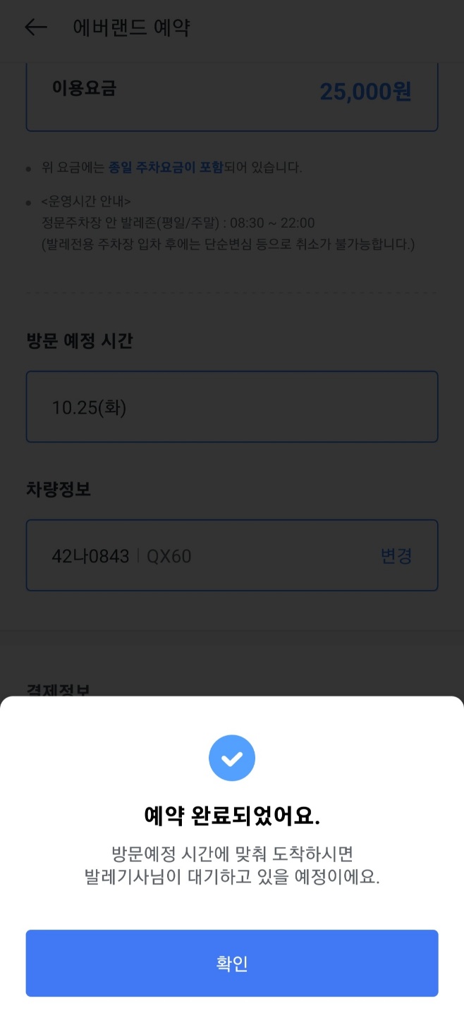 정문 주차장으로 오시면 정문주차장이 만차이더라도 정문주차장 발레파킹 라운지로 진입하시면 되고, 가격은 25,000원입니다.