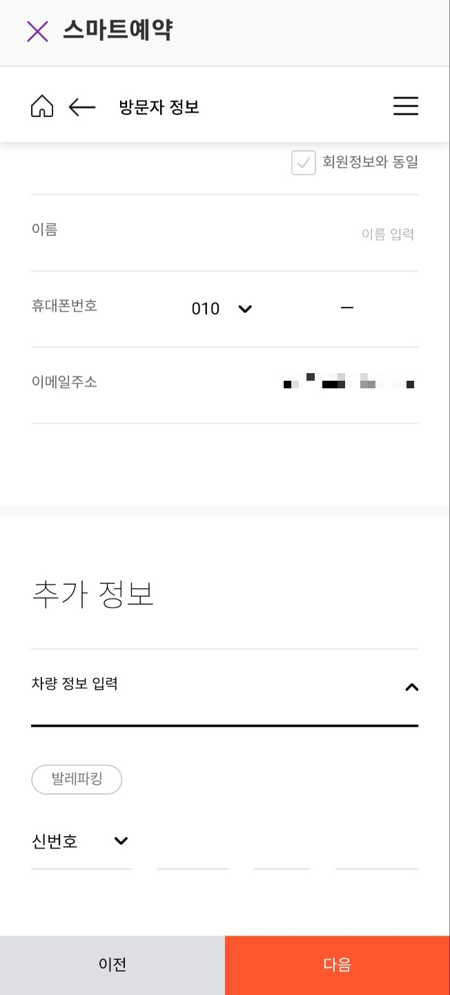 그럼 방문자 정보와 차량번호를 입력하고 결제진행 하시면 예약이 완료됩니다.
