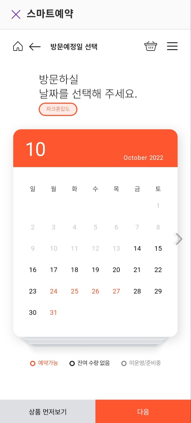 날짜를 고르고 다음을 누르면 예약하기 화면으로 전환됩니다.