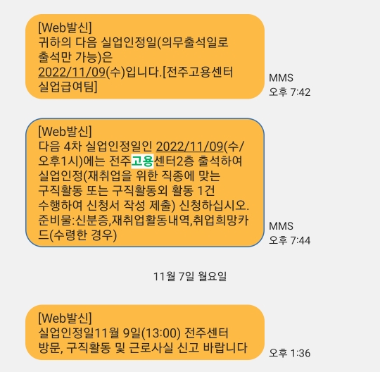 그래서 어떤 준비물을 가지고 출석해야 하는지, 출석해서 어떻게 실업인정을 받게 되는지 알아보겠습니다.3차 실업인정을 인터넷으로 전송하고 나면 이렇게 다음 실업인정일 안내가 문자로 옵니다.