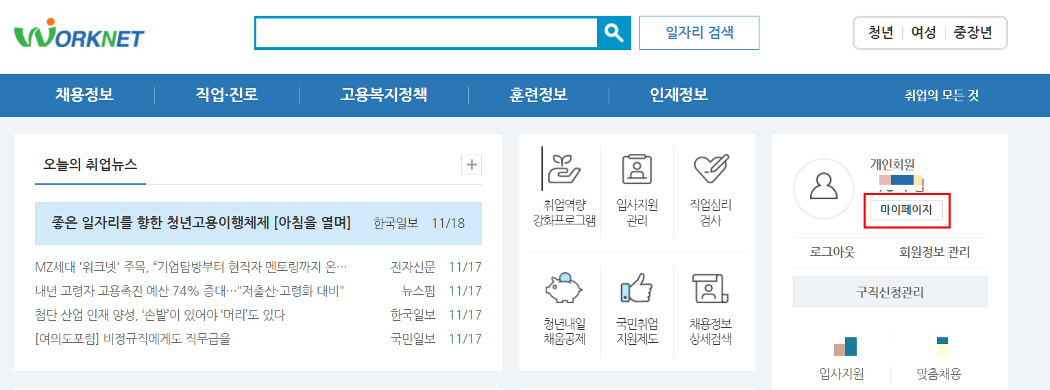 워크넷으로 구직신청을 하셨다 아래 방법으로 출력해서 가지고 가시면 됩니다.워크넷 홈페이지로 접속하여 마이페이지로 이동합니다.