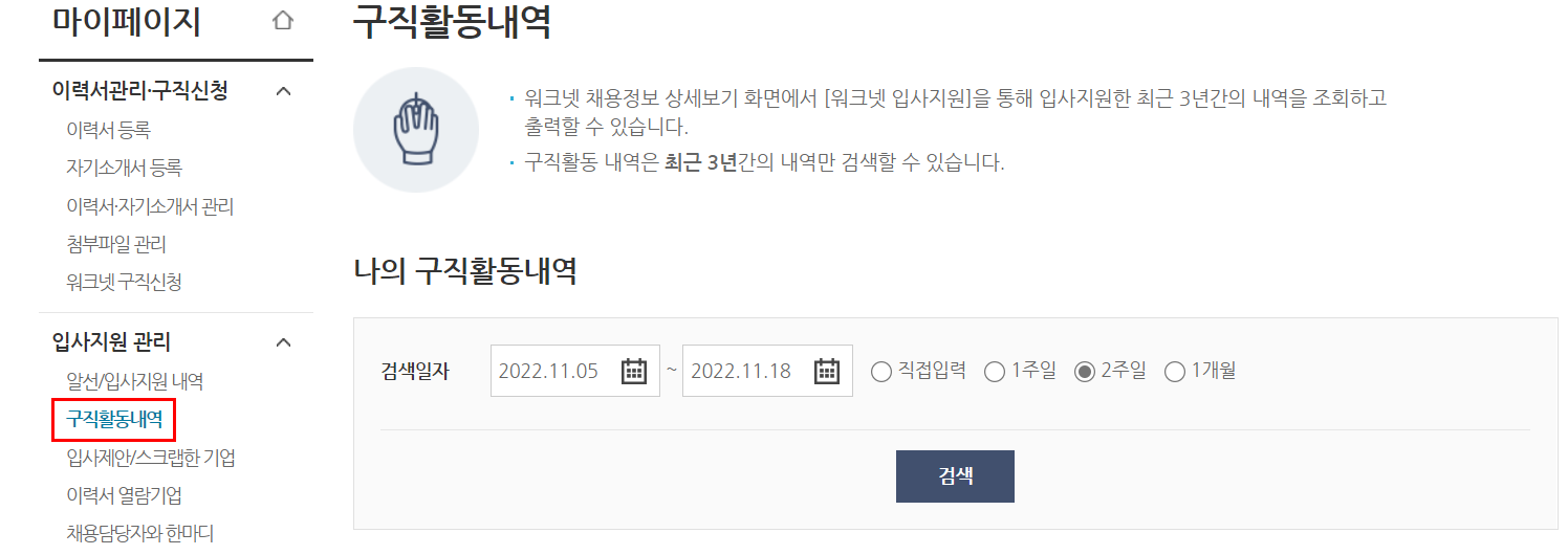 마이페이지> 입사지원관리> 구직활동내역으로 이동합니다.
