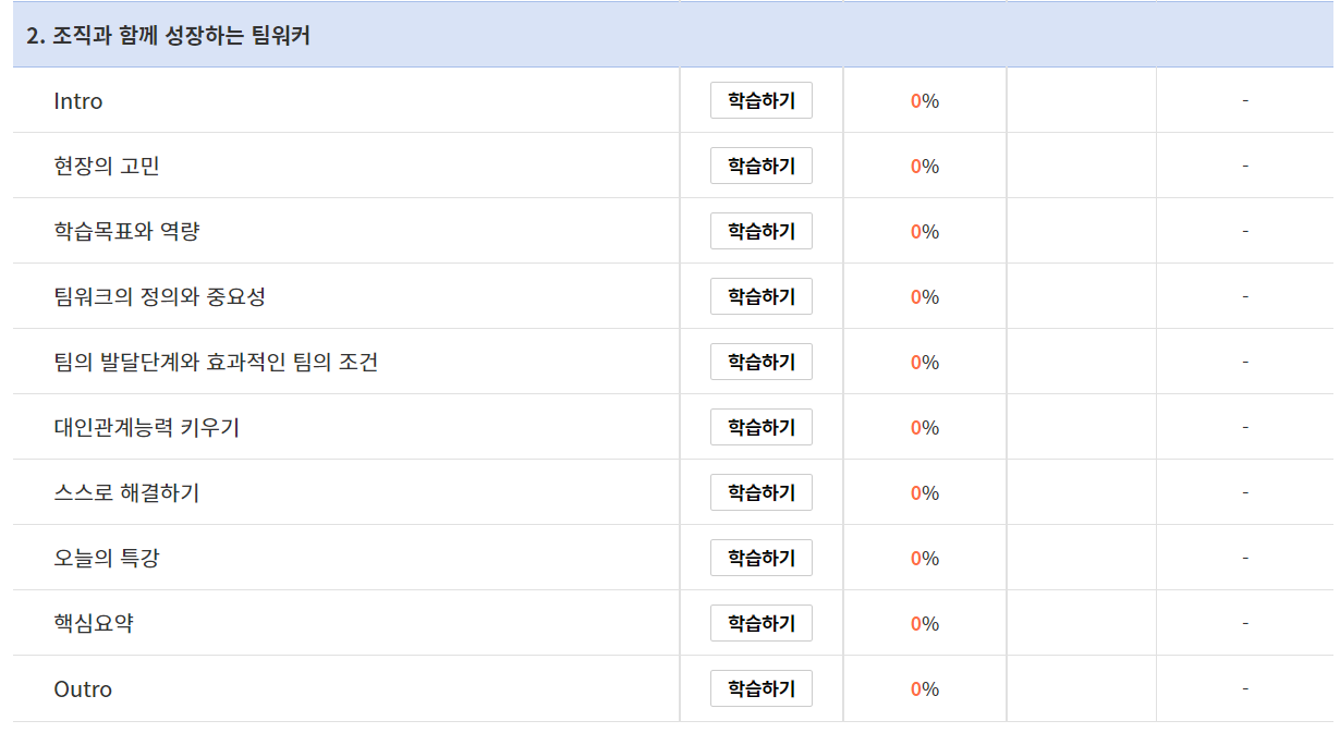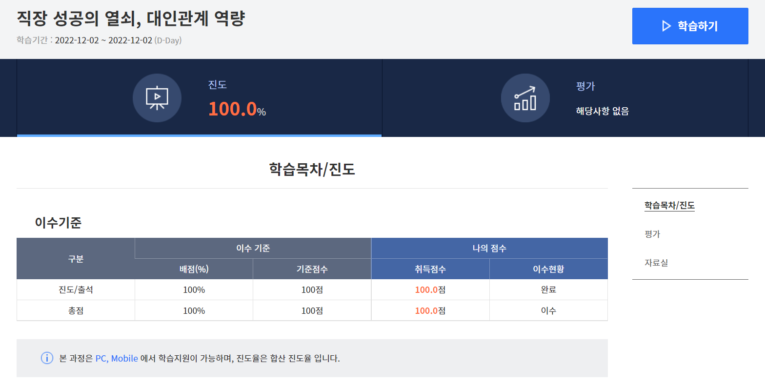 100% 이상 수강했을 시 수료 가능하며, 학습목차를 살펴본 후  수강신청을 했습니다.