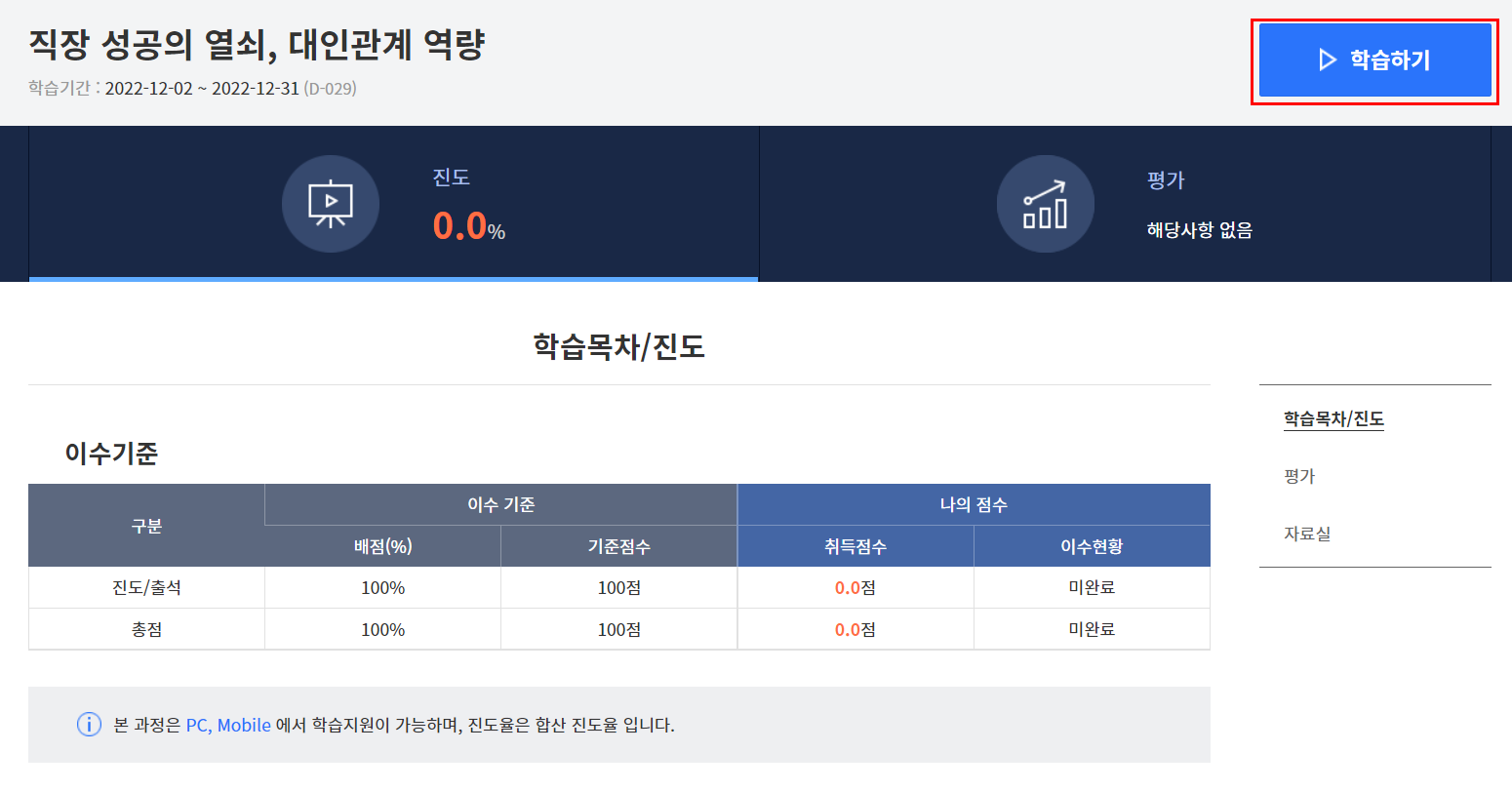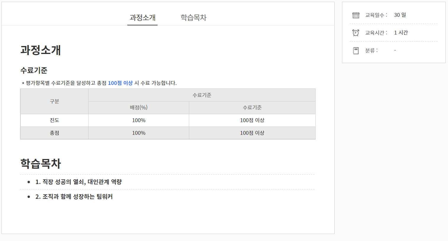 100% 이상 수강했을 시 수료 가능하며, 학습목차를 살펴본 후 수강신청을 했습니다.
