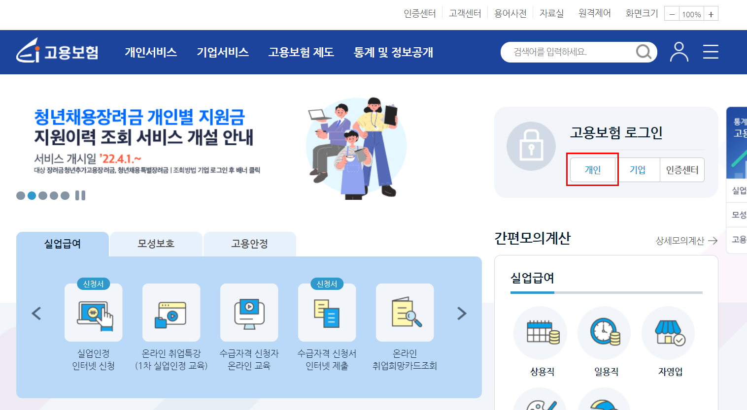 우선 고용보험 홈페이지에 접속하여 로그인을 합니다.