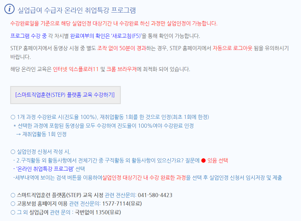 2차~4차까지는 1건의 재취업활동이 필요하니 실업인정 대상 기간내 1개의 온라인 취업특강을 듣는다면 다른 재취업활동 없이도 실업인정이 되는 것입니다.