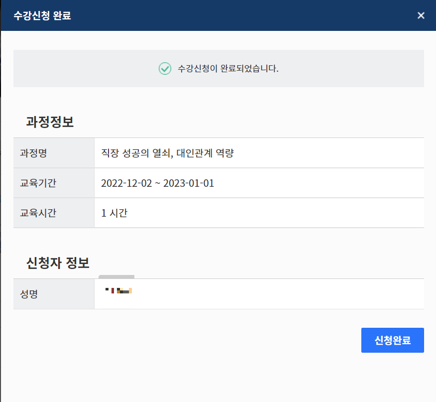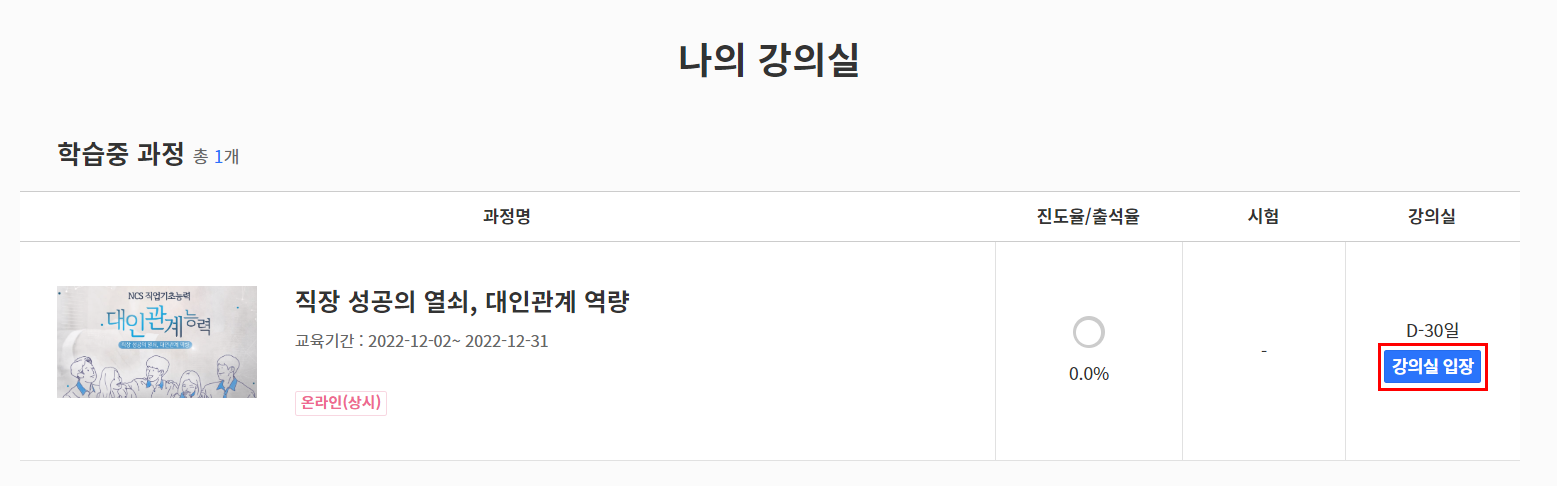 이렇게 수강신청을 한 후, 신청완료를 클릭하면 자동으로 나의 강의실로 이동합니다.
