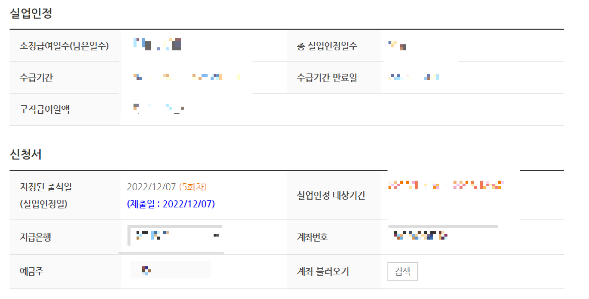 신청인과 실업인정 일수, 은행과 예금주를 확인합니다.