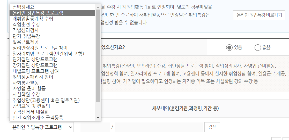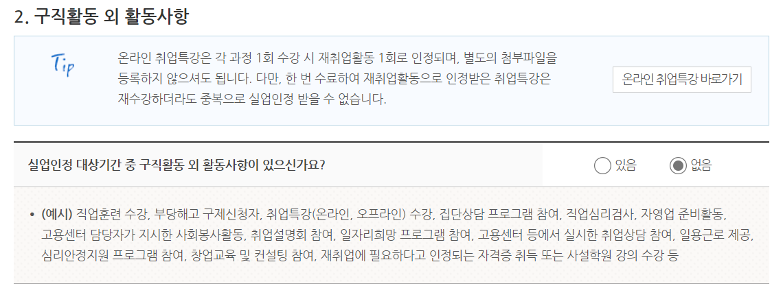 저는 구직 활동 1건과 온라인 취업특강을 수강하였기 때문에 구직활동내역 2는 구직활동 없음을 체크했습니다.