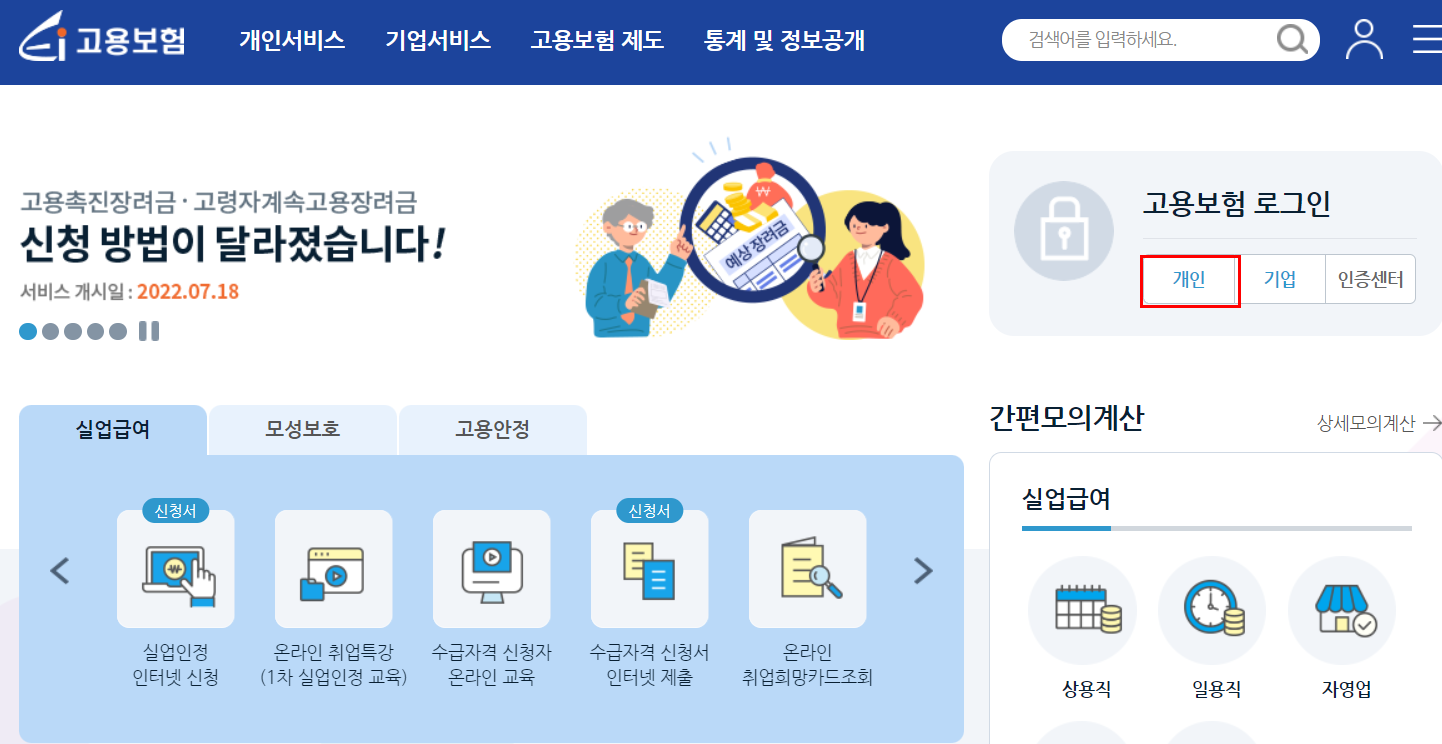 고용보험 홈페이지에 접속하여 로그인을 합니다.