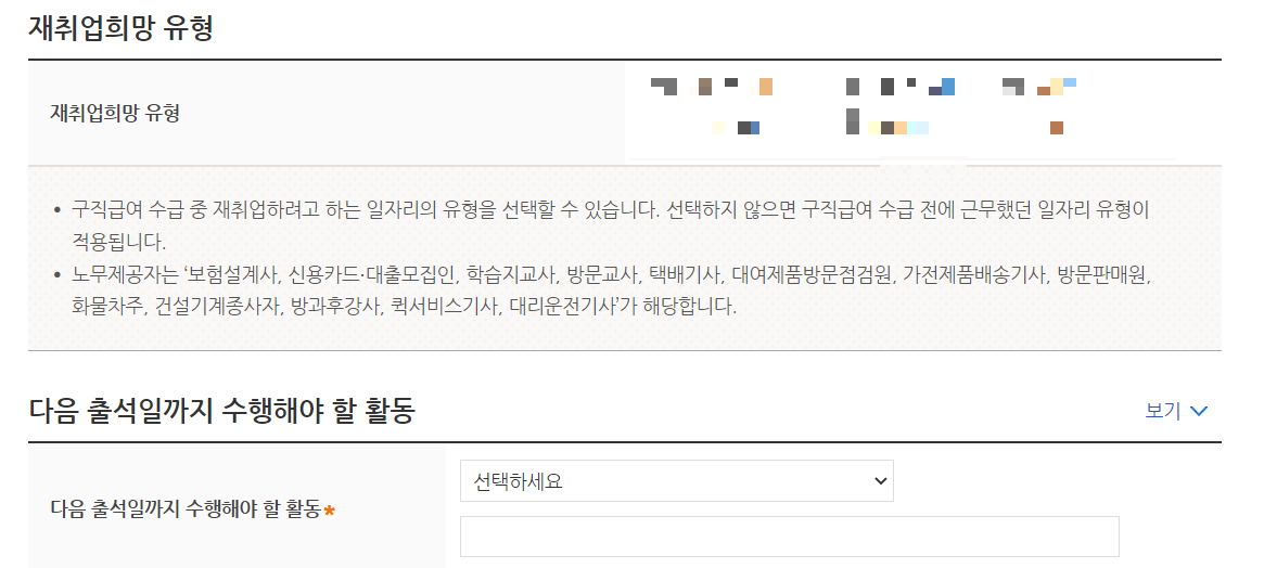 재취업희망 유형과 다음 출석일까지 수행해야 할 활동을 선택합니다.