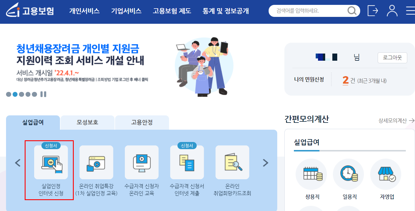 실업인정 인터넷 신청 부분을 클릭합니다.