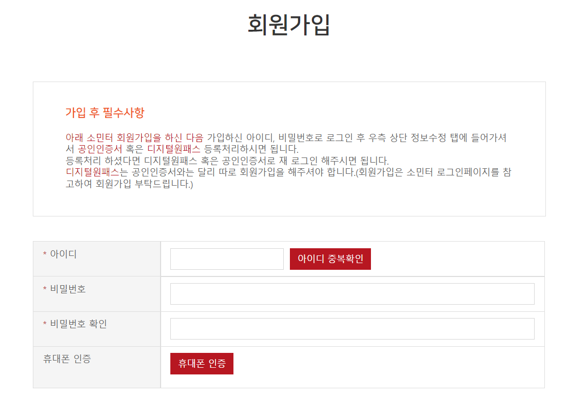 회원가입 아이디, 비밀번호, 주소 등을 입력 후 휴대폰으로 본인 확인 후 회원가입이 완료됩니다.