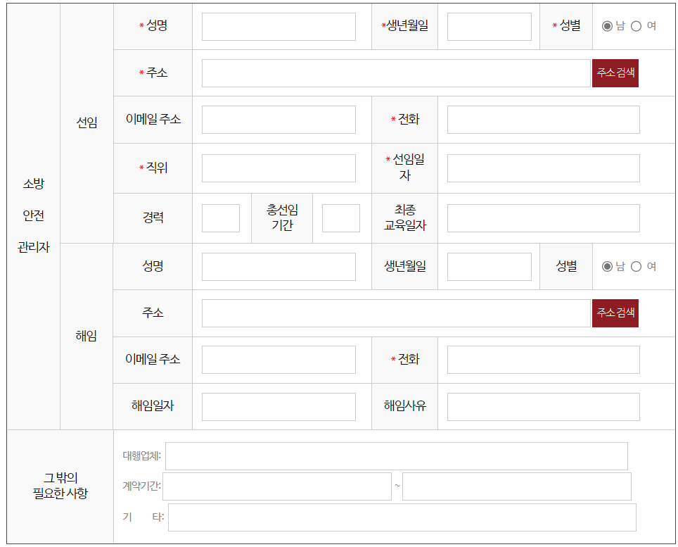 소방안전관리자로 선임될 사람의 이름, 생년월일, 성별, 전화번호, 직위, 선임 일자를 입력합니다.