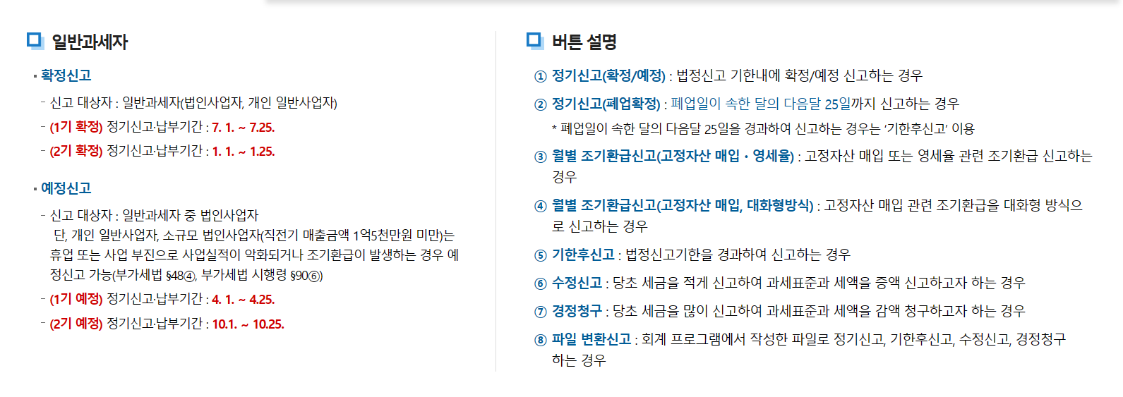 부가가치세는 1기와 2기와 나뉘는데 1기는 7월 1일~7월 25일까지, 2기는 다음 해 1월 1일부터 1월 25일까지가 신고 납부 기간입니다.