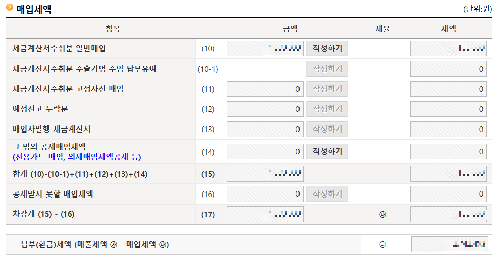 이제 매입했던 세금계산서 수취분 일반매입의 '작성하기'를 클릭합니다.