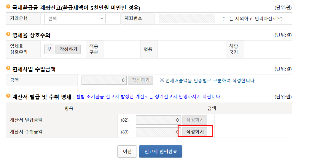 제일 아래 계산서 수취금액이 있다면 '작성하기'를 클릭합니다.