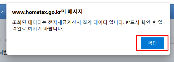 이 메시지에 '확인'을 클릭하면 메출처별 세금계산서 합계표가 자동으로 입력됩니다