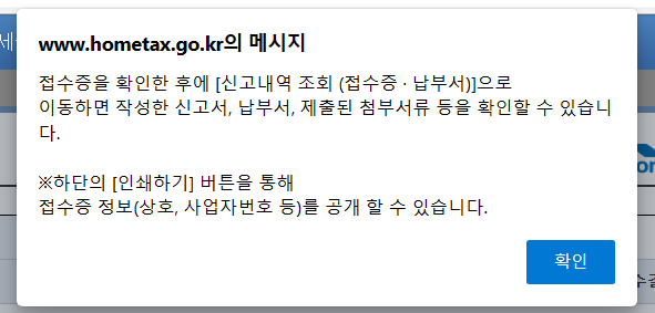 이 메시지에 확인을 누르면 부가가치세 신고서 접수증으로 이동합니다.