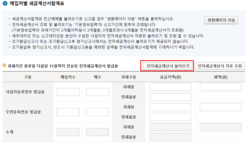 부가가치세 신고기간은 1일부터 25일까지 이지만 전자세금계산서를 자동으로 불러오기 위해서는 12일 이후부터 가능하니 참고하시기 바랍니다.