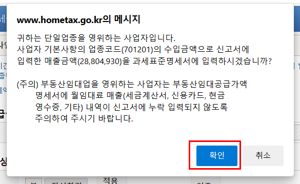 부동산임대공급가액 명세서를 작성하여야 한다는 메시지에 '확인'을 누르면 부동산임대공급가액명세서로 이동합니다.