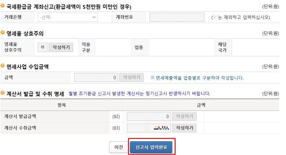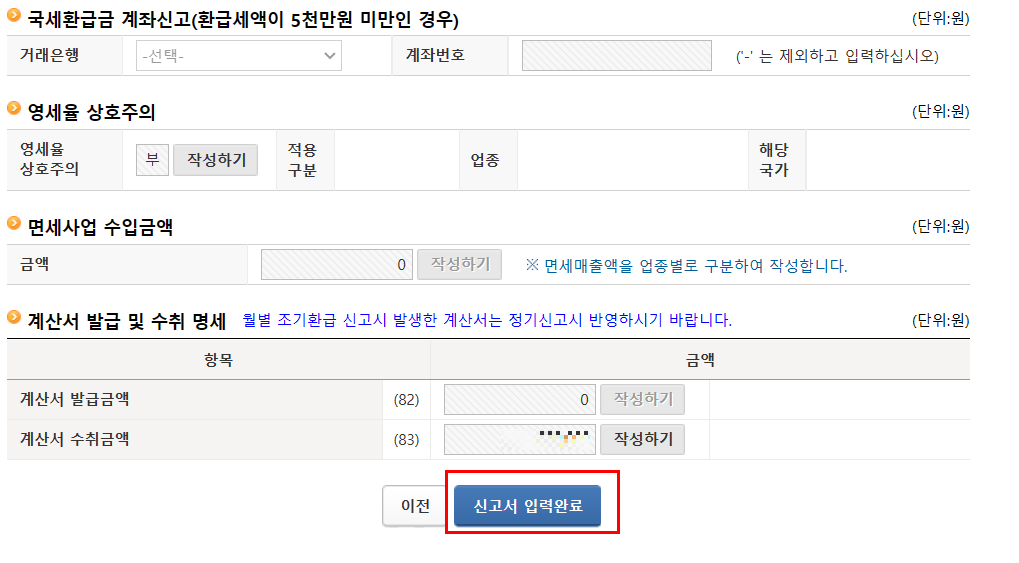 계산서 수취금액까지 확인한 후 신고서 입력완료를 클릭합니다.