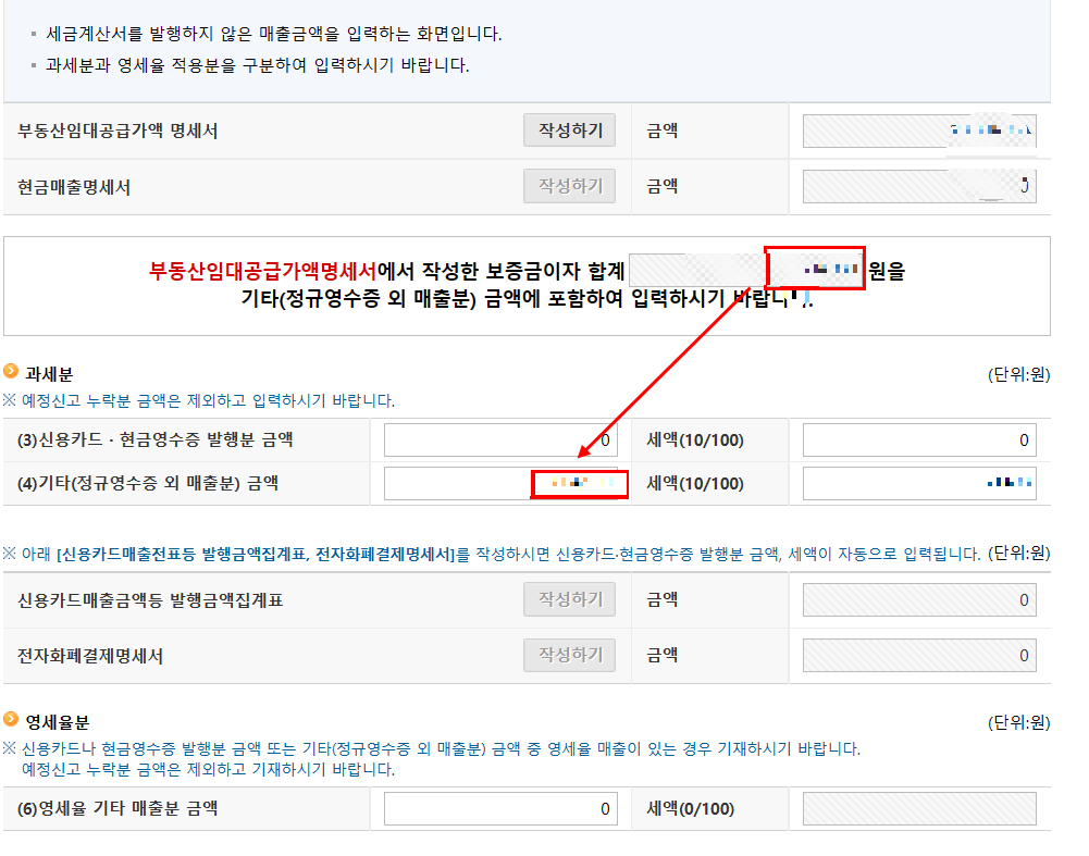 다음을 누르면 기타 매출분으로 이동하는데 부동산임대공급가액명세서에서 작성한 보증금이자 합계를 과세분 > 4번의 기타(정규영수증 외 매출분) 금액에 입력합니다. (입력하라고 되어 있지만 자동으로 입력되어 있음)