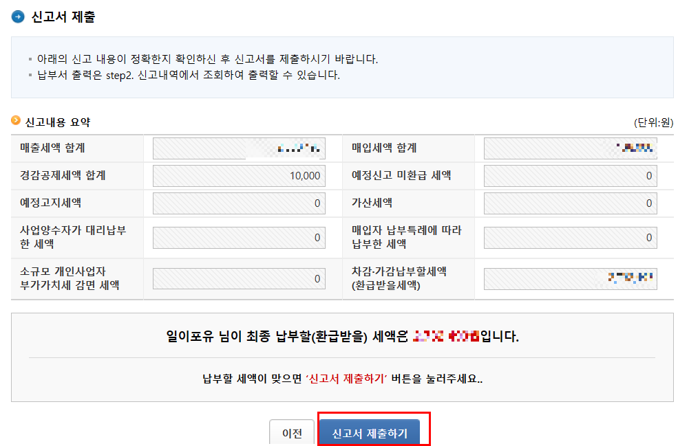 신고내용 요약의 매출세액 합계와 매입세액 합계, 경감공제세액 등을 확인한 후 최종 납부할 세액을 을 확인합니다.