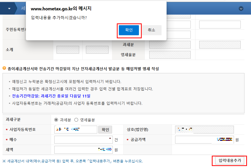 입력 후 추가 매입처가 있다면 입력내용추가를 클릭하시면 됩니다.