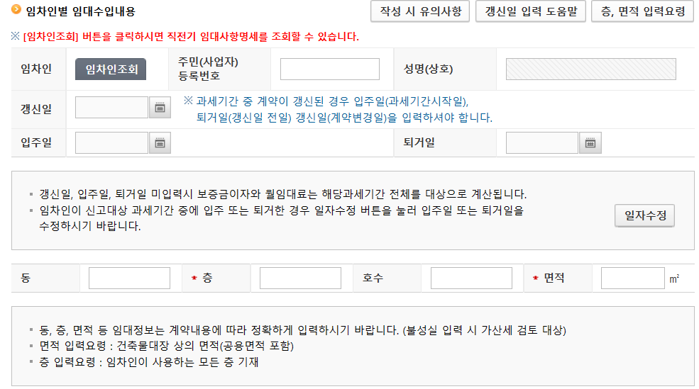부동산임대공급가액명세서에 임차인의 정보를 입력합니다.