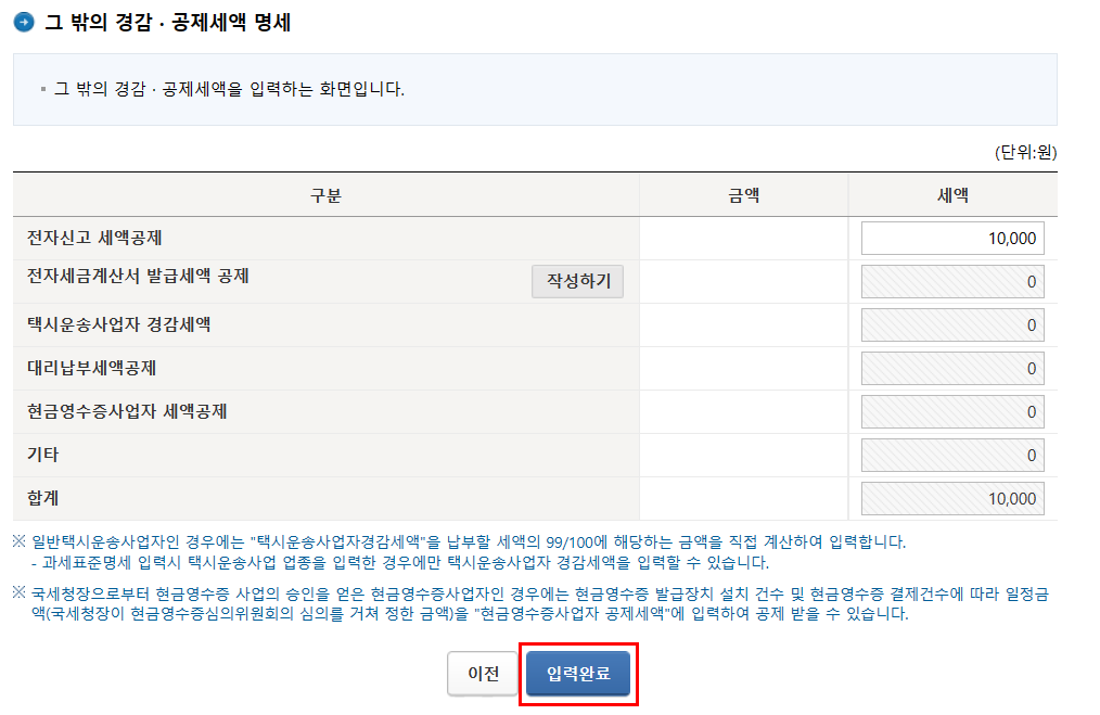 입력한 매입처 수, 매수, 공급가액, 세액을 확인 후 '입력완료'를 클릭합니다.