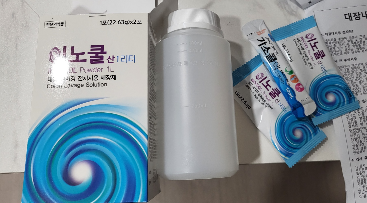 대장내시경을 하기 전 약에 대해 많은 말들을 들었습니다. '약이 정말 곤욕스럽다, 예전보단 많이 좋아졌다, 알약도 있어 편하다' 등의 말이었습니다. 그래서 대장내시경 약을 알약으로 먹어야겠다 생각하고 있었지만 병원에 문의하니 알약과 물약모두 먹어야 하는 물의 양은 비슷하다고 하여 물약으로 받아 왔습니다.
