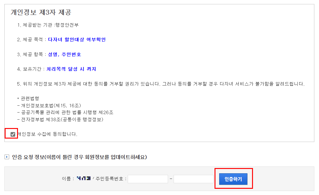 다자녀로 할인을 받기 위해선 우선 다자녀 가정 인증절차가 완료되어야 합니다.